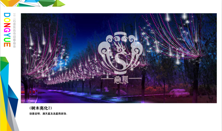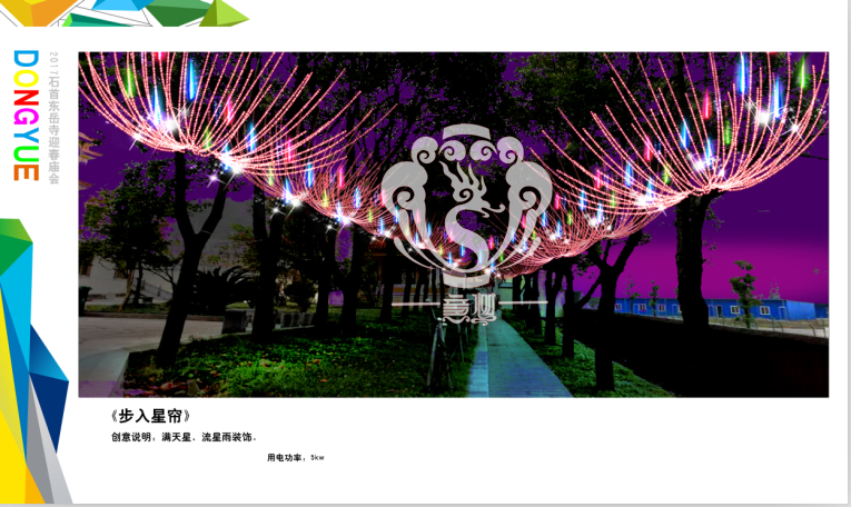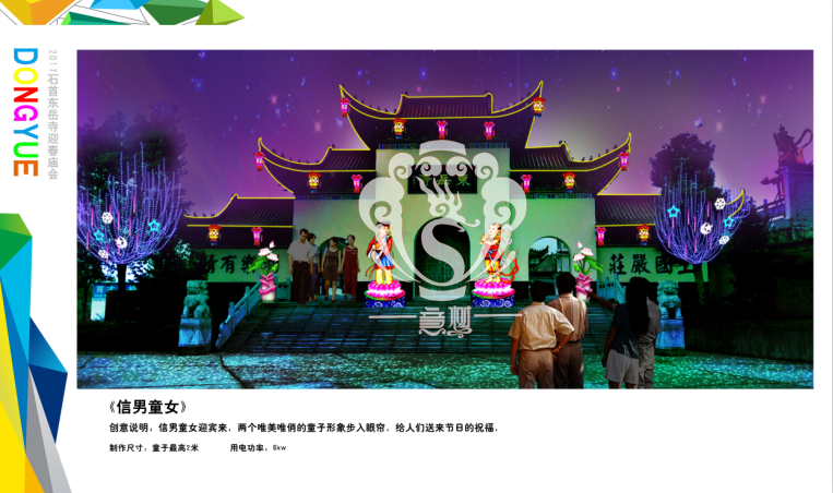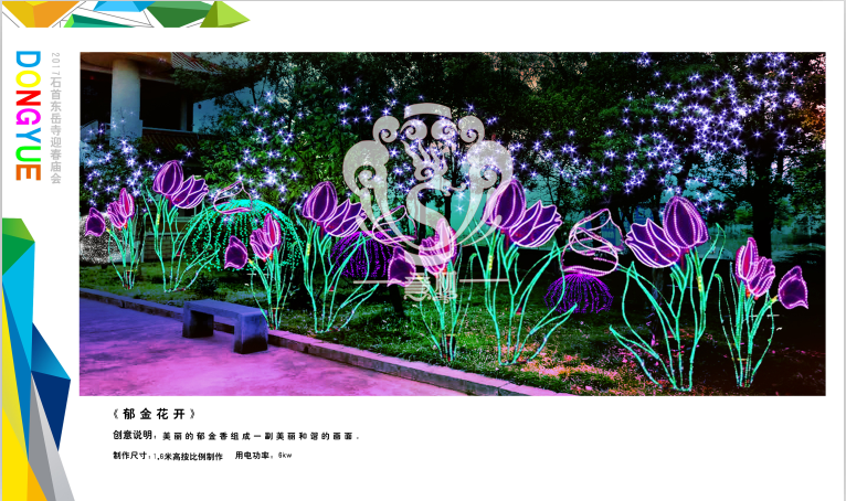 本次設(shè)計(jì)方案形式新穎、亮點(diǎn)突出、格調(diào)高雅,與“迎春、禮佛”的主題環(huán)環(huán)相扣,喜慶的節(jié)日氛圍在這交相輝映的盛世燈組中得到體現(xiàn),讓整個(gè)東岳寺充滿著舞動(dòng)心弦的魅力。透過本次高品位氛圍體會(huì)到時(shí)代發(fā)展為人們帶來了更新、更加美好的幸福生活。