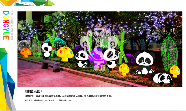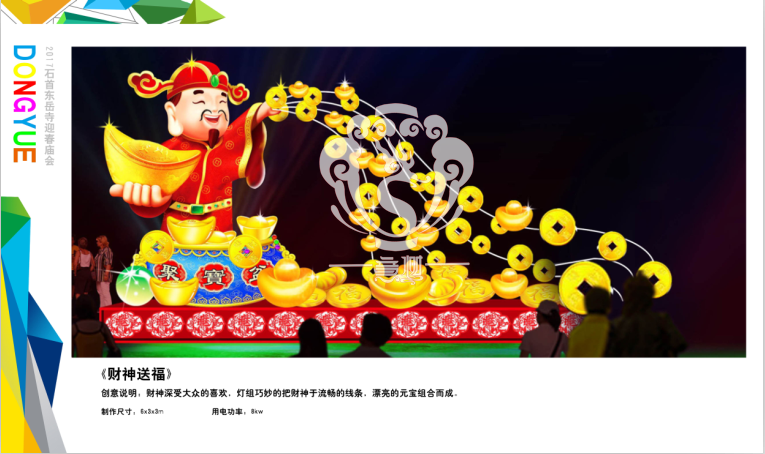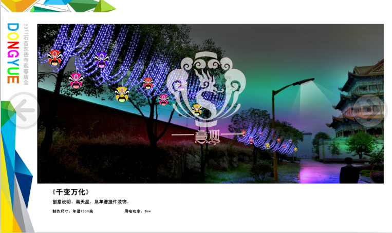 滿懷喜悅,深感榮幸。自貢市意樹文化傳播有限公司通過對(duì)湖北荊州石首東岳寺的實(shí)地考察,和我們的不懈努力,《湖北荊州石首東岳寺首屆迎春燈會(huì)方案》設(shè)計(jì)工作圓滿完成。我們結(jié)合東岳寺特色及氛圍營造亮化區(qū)域地形地貌,緊抓“歡慶佳節(jié)”的設(shè)計(jì)主題,把迎春燈會(huì)精心打造成2017年迎春的亮點(diǎn),獻(xiàn)上盛大的視覺歡樂盛宴!