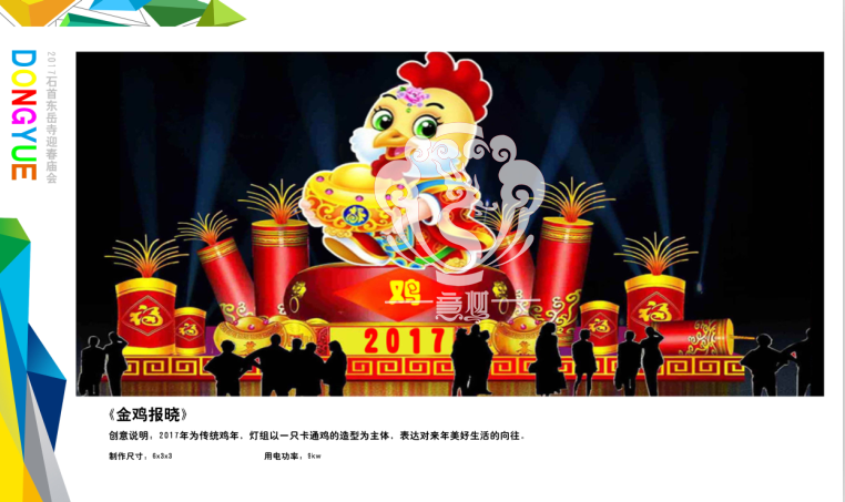 本屆燈會(huì)的策劃、設(shè)計(jì)將傳統(tǒng)性、科技性、環(huán)保性集為一體,運(yùn)用現(xiàn)代光源科技表現(xiàn),使得燈景相映,把本屆燈會(huì)打造成一個(gè)雅俗共賞、生動(dòng)活潑的雞年燈景和禮佛世界。我們緊緊圍繞中國彩燈照亮東岳寺主題,從東岳寺當(dāng)?shù)匚幕由熘两瘛?萍贾黝},將荊南多姿多彩的城市風(fēng)情、名俗風(fēng)物,經(jīng)彩燈特有表現(xiàn)手法精準(zhǔn)獨(dú)到的鋪陳,靈動(dòng)細(xì)膩的變化,深入淺出的詮釋,不僅讓全市人民看到裝飾一新的東岳寺,也能讓來自五湖四海的游客和回家過年的游子在賞燈的同時(shí),增強(qiáng)對(duì)荊南近年來巨大變化的了解,勢(shì)必成為促進(jìn)荊南地區(qū)與各界交流的一個(gè)新橋梁,為荊南的和諧、蓬勃發(fā)展增輝添彩。