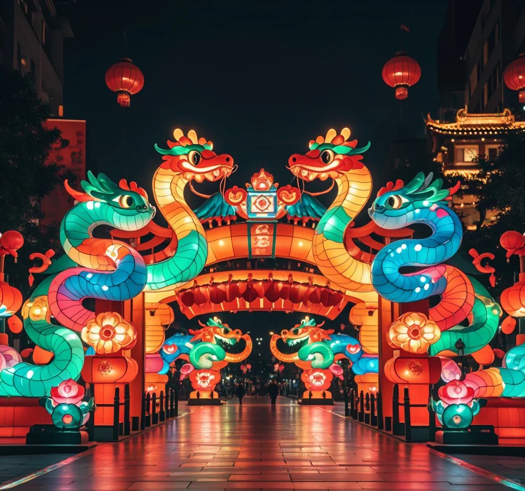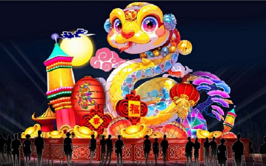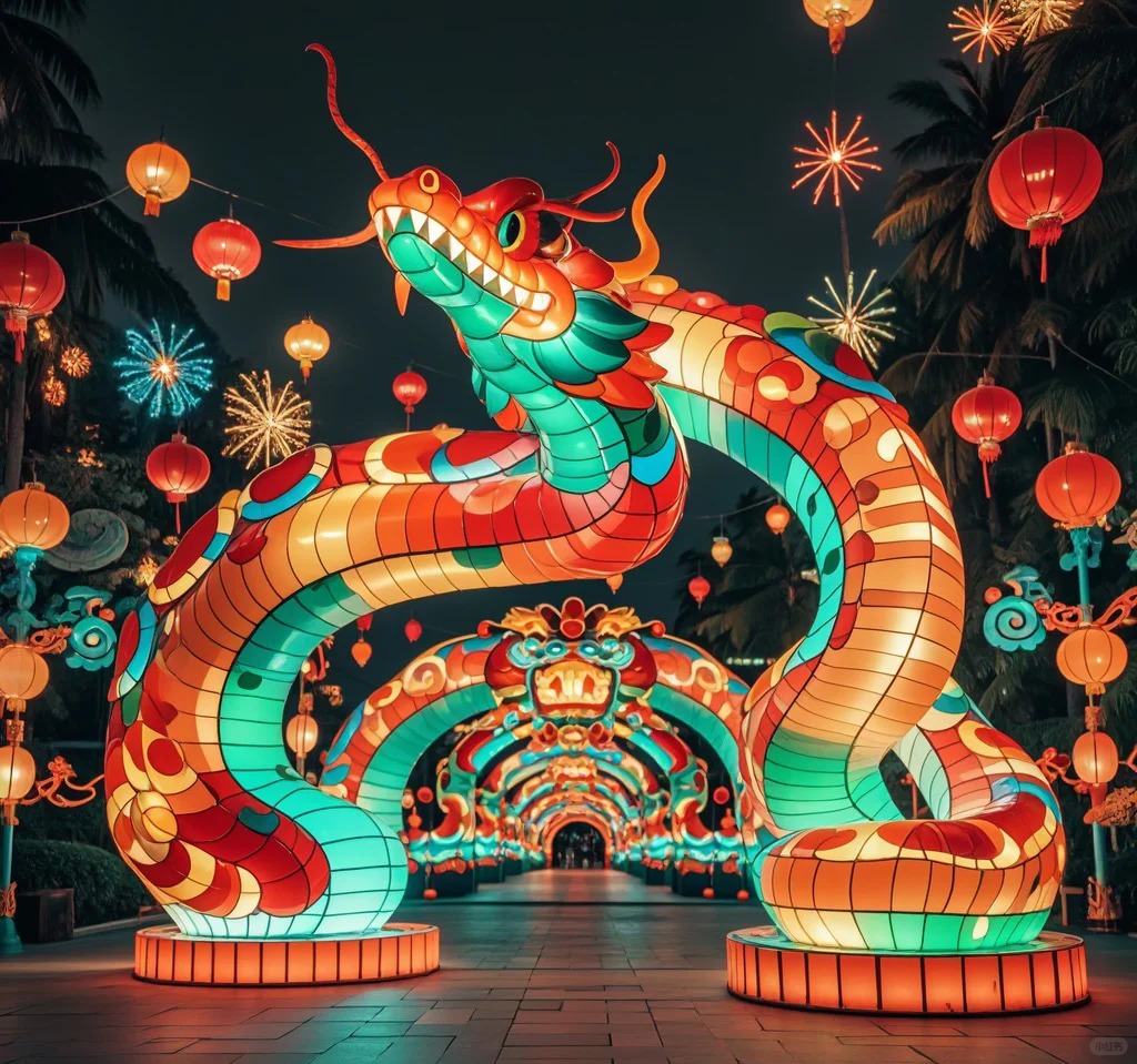 那一盞盞精心制作的新春蛇年花燈會(huì),以其獨(dú)特的造型和絢麗的色彩,瞬間抓住了人們的目光。巨大的蛇形彩燈高高聳立,它的身軀蜿蜒曲折,鱗片在燈光的映照下熠熠生輝,仿佛一條靈動(dòng)的神蛇降臨人間。蛇首高高昂起,眼神中透露出威嚴(yán)與神秘,仿佛在守護(hù)著這片歡樂(lè)的土地。