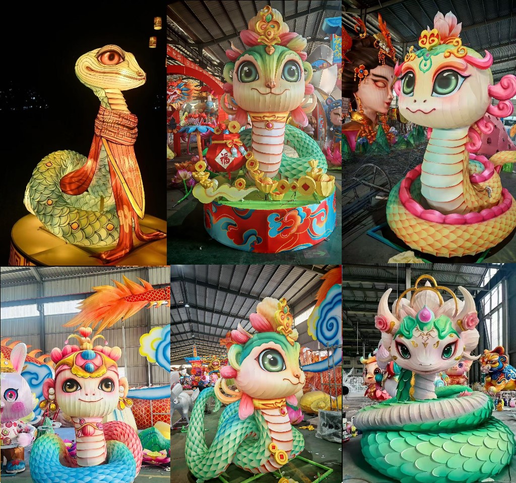 走近細(xì)看,自貢彩燈制作的工藝精湛絕倫。每一片鱗片都經(jīng)過(guò)精心雕琢,色彩斑斕,或金黃閃耀,寓意著財(cái)富與榮耀;或翠綠欲滴,象征著生機(jī)與希望。彩燈上還裝飾著各種精美的圖案,有盛開(kāi)的花朵,寓意著繁榮昌盛;有飛舞的蝴蝶,代表著幸福與美好。這些圖案與蛇的形象完美融合,展現(xiàn)出了獨(dú)特的藝術(shù)魅力。